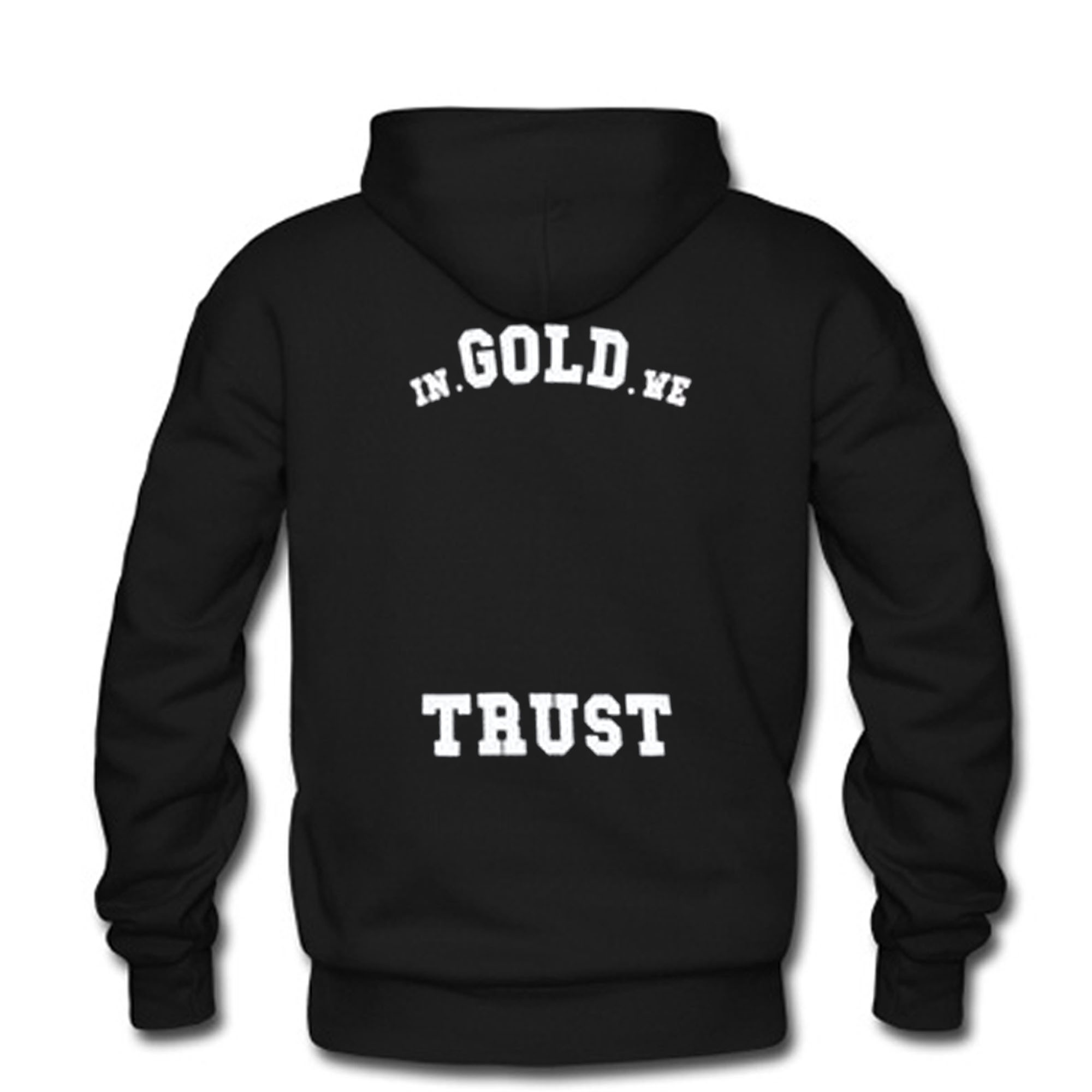 Op Amerikaanse dollarbiljetten staat de tekst ‘in God we trust’ – beetje merkwaardig om dat op geld te zetten, maar goed. Op deze hoodie staat het net anders – er is een hele kledinglijn van, met dit motto erop: ‘in gold we trust’. Is dat niet eerlijker voor heel veel van ons?