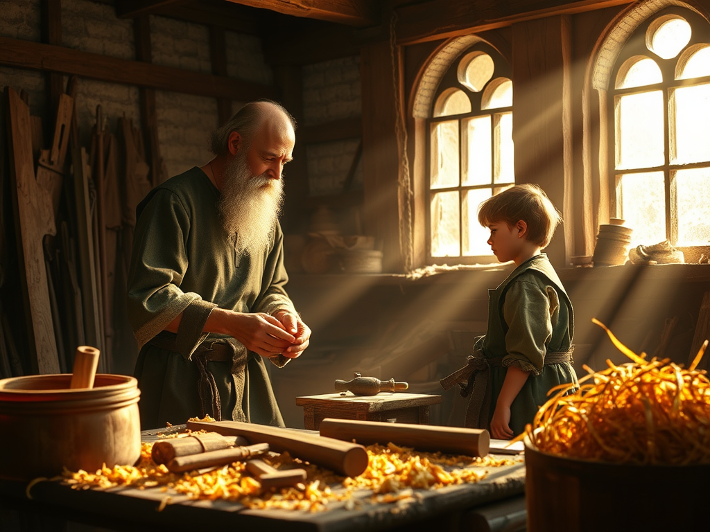 Maar ook als je je aansloot bij zo’n gilde, kon je niet meteen meubelmaker worden. Nee, je moest een opleiding doen. En die opleiding bestond niet uit boeken lezen – de meeste mensen konden niet eens lezen in de middeleeuwen! Je leerde het vak in de praktijk. Je begon als leerling bij een meester in het meubel maken. Je moest de houtkrullen opvegen, kleine klusjes doen, en intussen zag je hoe de meestermeubelmaker te werk ging. Je hoorde hem praten over opdrachten en ontwerpen, zag hem bezig, en zo kreeg je een idee van wat het inhoudt om meubelmaker te zijn.